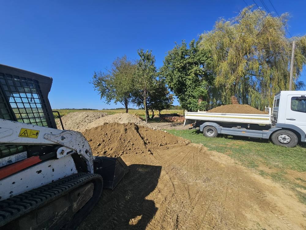 • Zemljani radovi, čišćenja terena, planiranje i nasipavanje dvorišta, iskop temelja, rovova za instalacije, dovoz rasutih materijala