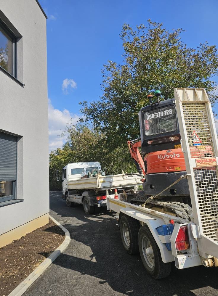 • Zemljani radovi, čišćenja terena, planiranje i nasipavanje dvorišta, iskop temelja, rovova za instalacije, dovoz rasutih materijala